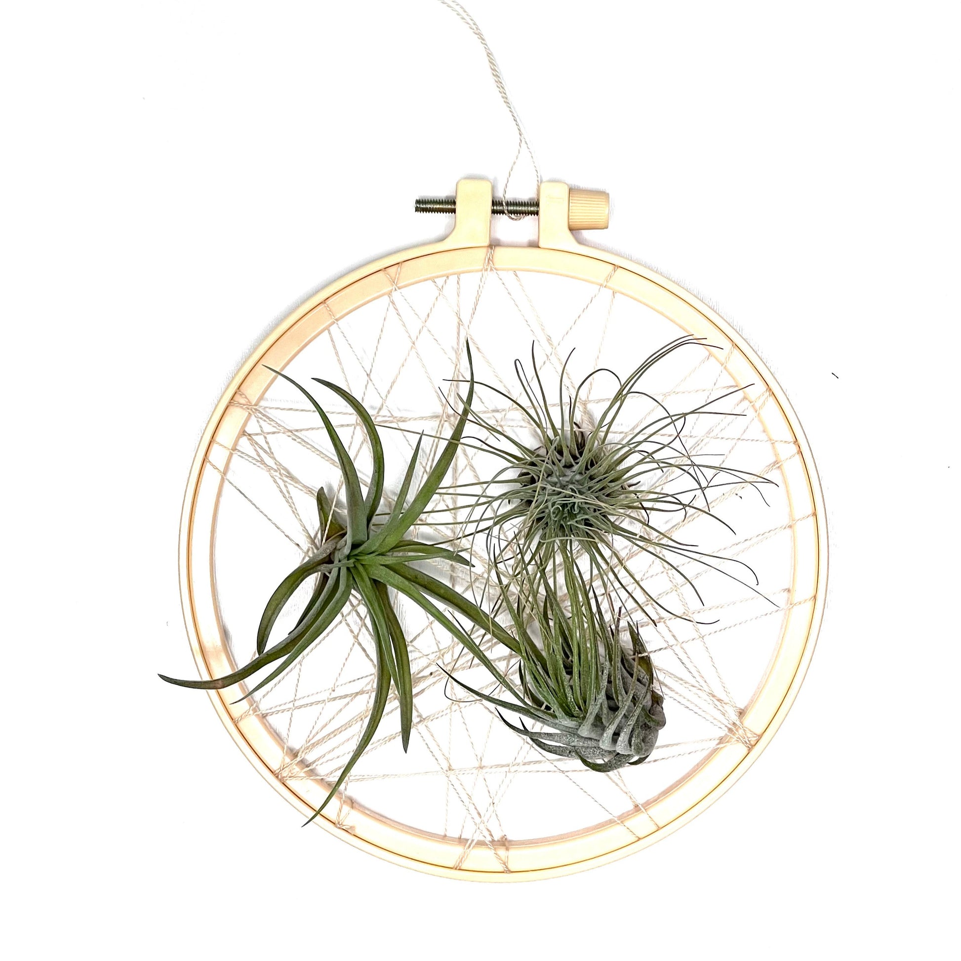 Suportul este realizat dintr-un cerc de plastic îmbrăcat cu ață, în care plantele sunt susținute elegant de fire textile, fără lipici sau pământ – o combinație modernă între design boem și natură vie.